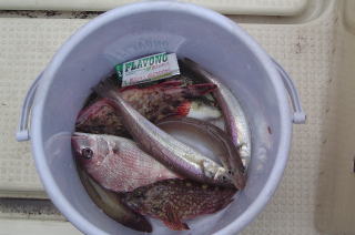 次に,野島鼻西300〜400mの岩場前でやってみる。ホゴメバルが上がるが,根掛かりが激しい。お隣ではタコ漁師さんがタコテンヤでがんばっておられる。底は岩礁帯のようだ。